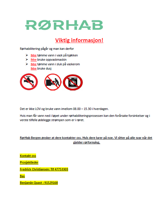 Ikke tømme vann i vasken, ikke bruke oppvaskmaskin og vaskemaskin, ikke tømme vann i sluk på vaskerom, ikke bruke dusjen og minimal bruk av toalettet. Varighet er kl.08:00 - 15:30.
